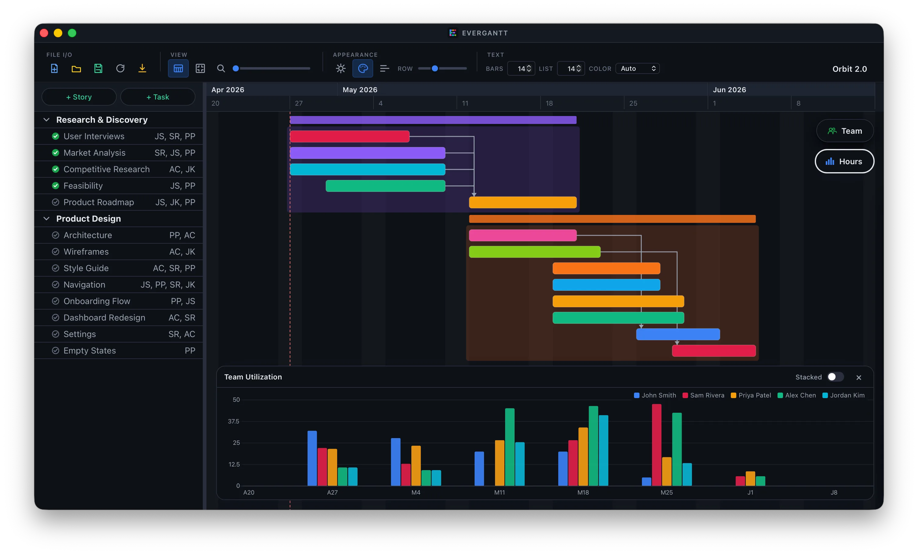 EverGantt window showing a multi-story project with a Team Utilization capacity panel docked at the bottom